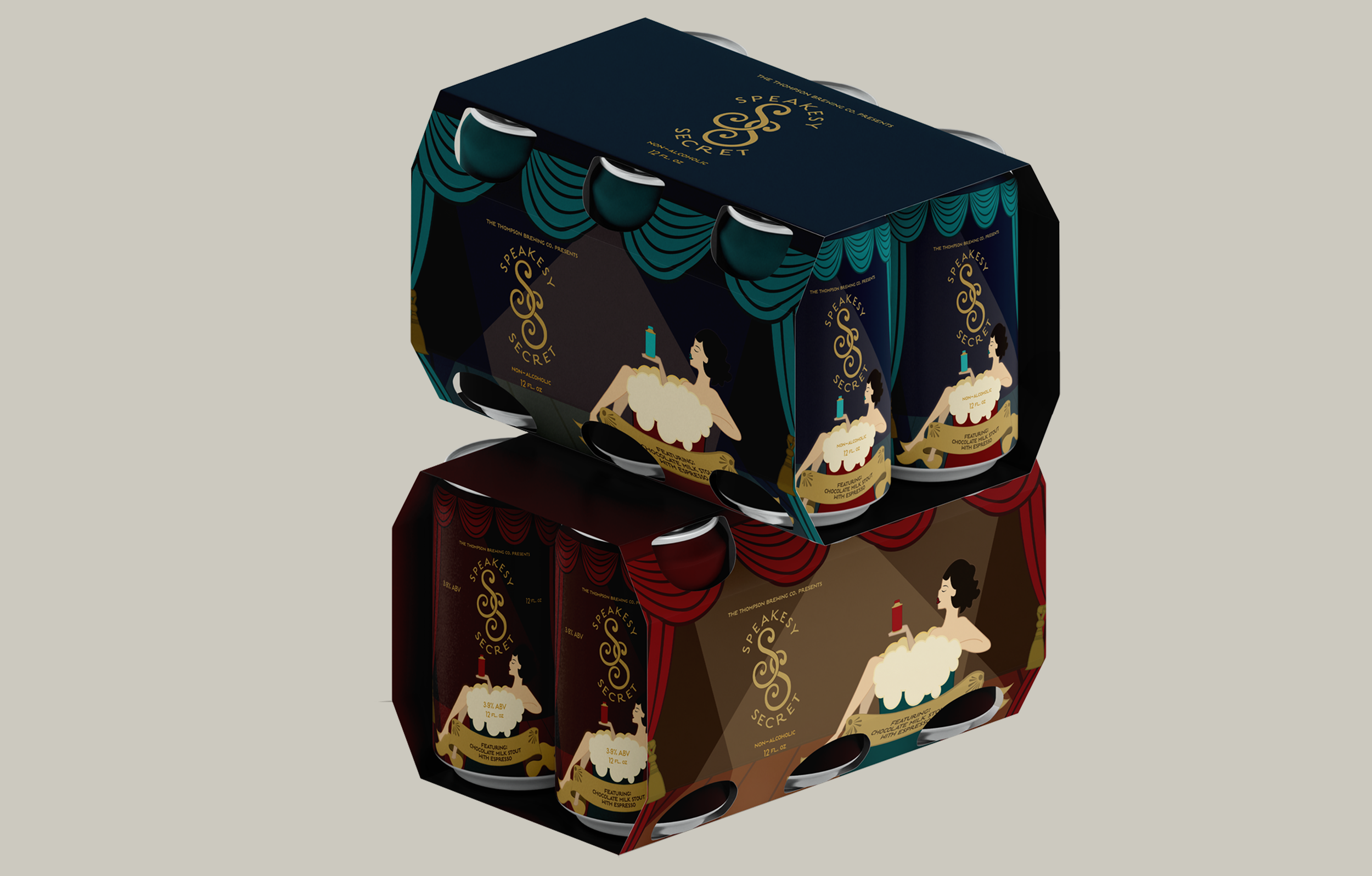 Mother’s Secret is a fictional beer brand marketed to mothers who want to have a moment to relax. The design and formula will appeal to both women and men wanting a small-town brewed stout. Two varieties of the stout are offered: one with and one without alcohol, so that even new mothers can safely enjoy Speakesy Secret. The package design emulates a 1920’s pinup with a simplified modern twist. The packaging also includes gold foiling to give the design a unique pop that is not overly flashy but grabs your attention.